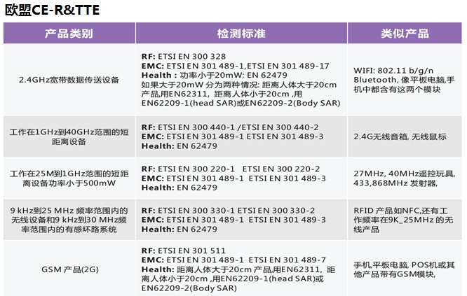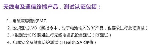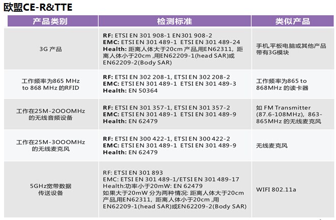 2014年5月22日,無線電設備指令(TheRadio Equipment Directive,RED)2014/53/EU正式在歐盟官方公報(OG)上公布,并于2014年6月12日生效。該指令將取代無線電與電信終端設備指令(R&TTE指令),2016年6月12日之前,成員國應將該指令轉化為成員國法律,原R&TTE指令(1999/5/EC)也隨之作廢。2016年6月13日起,成員國應采用新無線電設備指令(RED);2017年6月13日起,符合舊R&TTE指令的產品將不允許在歐盟市場上銷售。 On May 22, 2014, RED2014/53/EU Officially published in theEuropean Union's official gazette , and take effect on June 12, 2014. Thedirective will replace R&TTE directive, Before June 12, 2016, member statesshould convert the directive to member states law and the original R&TTEdirective (1999/5 / EC) is invalid. June 13, 2016, member states should adoptthe new RED; from June 13, 2017 products that meet the old R&TTE directivewill not be allowed in the eu market.
