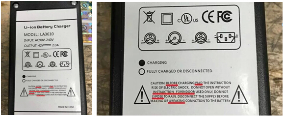 一款標(biāo)簽錯誤百出的平衡車充電器: