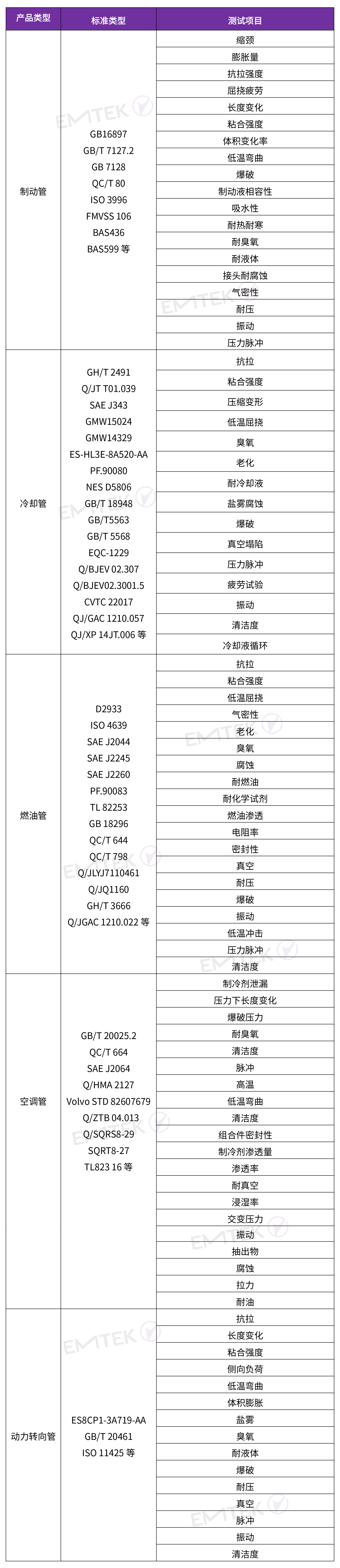 室溫/高溫爆破、耐壓、耐真空、壓降/泄露密封性、振動(dòng)/壽命循環(huán)、氣脈沖耐久、低壓/高壓脈沖、壓力/振動(dòng)/溫度(PVT)、低溫沖擊、碎石沖擊、真空坍塌、冷熱沖擊脈沖、撓曲疲勞耐久等;