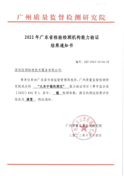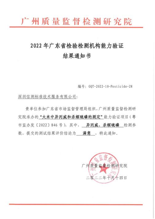 近日,在由廣東省市場監(jiān)督管理局組織、廣州質(zhì)量監(jiān)督檢測研究院承辦的“2022廣東省檢驗(yàn)檢測機(jī)構(gòu)能力驗(yàn)證”中,信測標(biāo)準(zhǔn)參加的“大米中鎘、異丙威和殺螟硫磷的測定”食品檢測領(lǐng)域3個能力驗(yàn)證項(xiàng)目,均獲得“滿意”!