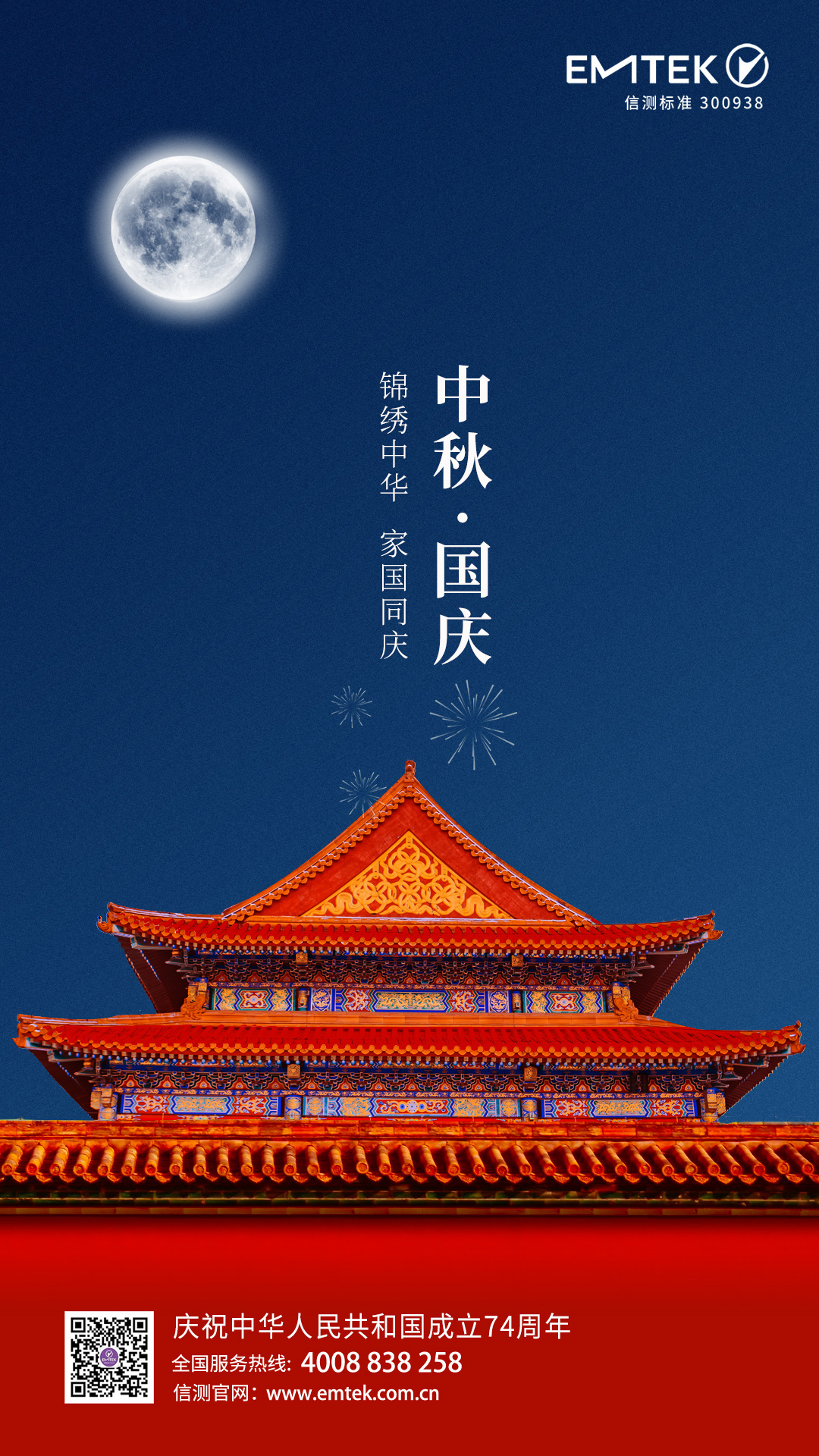 時值中秋國慶相逢喜慶之際,EMTEK信測標(biāo)準(zhǔn)衷心祝福偉大祖國繁榮昌盛,國泰民安!祝愿大家闔家團(tuán)圓,幸福安康,節(jié)日快樂!