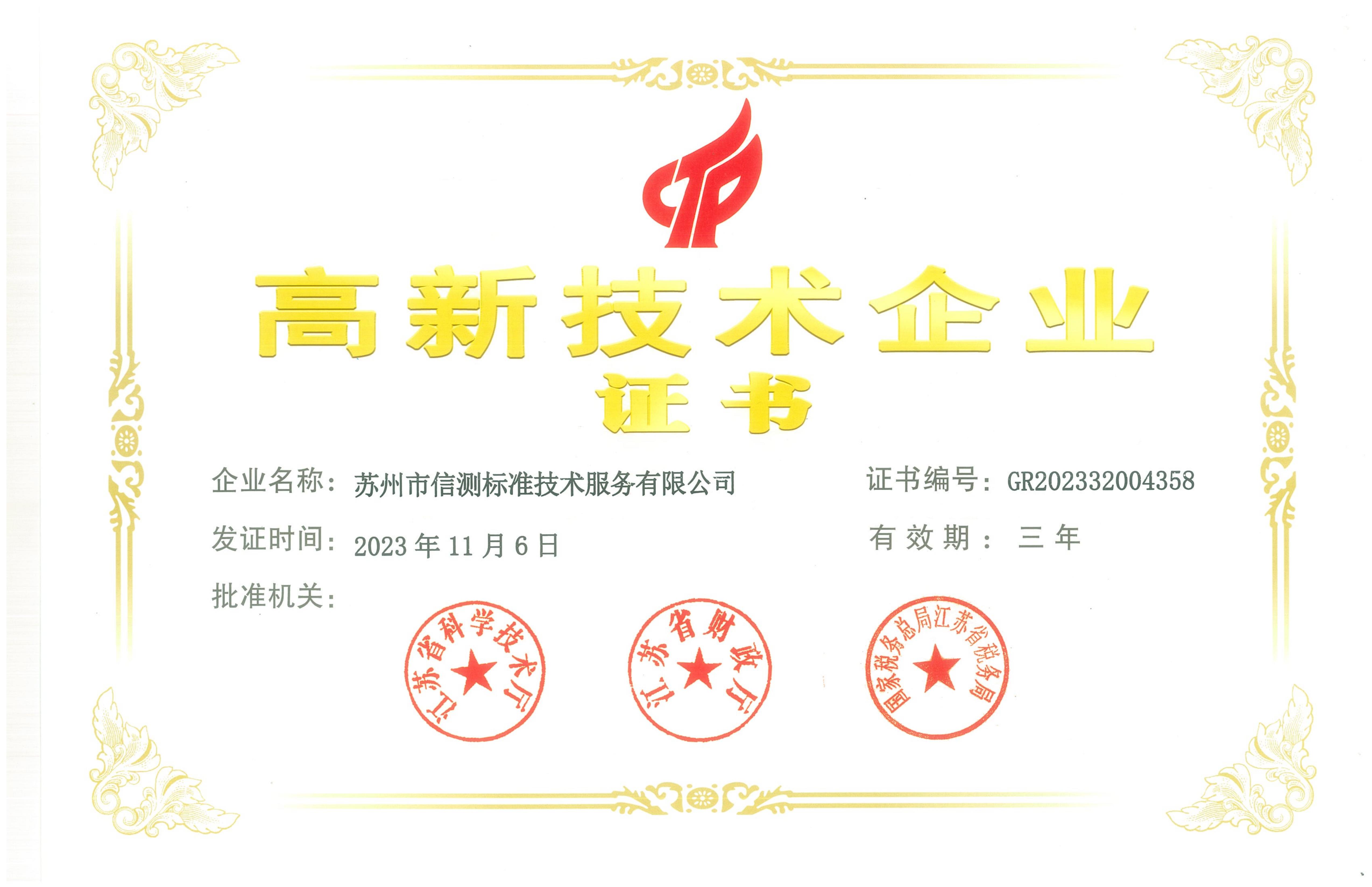 近日,蘇州市信測(cè)標(biāo)準(zhǔn)技術(shù)服務(wù)有限公司(以下簡(jiǎn)稱(chēng):蘇州信測(cè))再度獲得由江蘇省科學(xué)技術(shù)廳、江蘇省財(cái)政廳、國(guó)家稅務(wù)總局江蘇省稅務(wù)局聯(lián)合頒發(fā)的“高新技術(shù)企業(yè)”認(rèn)定證書(shū)!