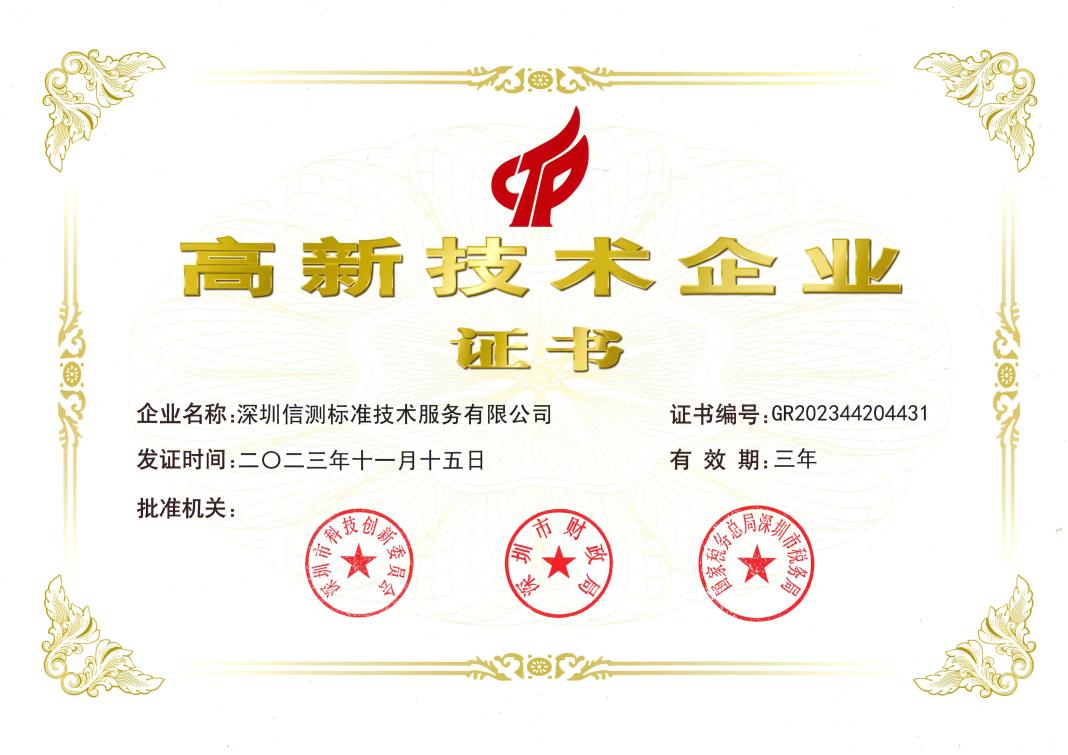 近日,深圳信測標(biāo)準(zhǔn)技術(shù)服務(wù)有限公司(寶安檢測基地)榮獲由深圳市科技創(chuàng)新委員會、深圳市財政局、國家稅務(wù)總局深圳市稅務(wù)局聯(lián)合頒發(fā)的“高新技術(shù)企業(yè)”認證證書。這是對我司技術(shù)管理、服務(wù)水平、研發(fā)實力和發(fā)展前景充分認可的有力證明。