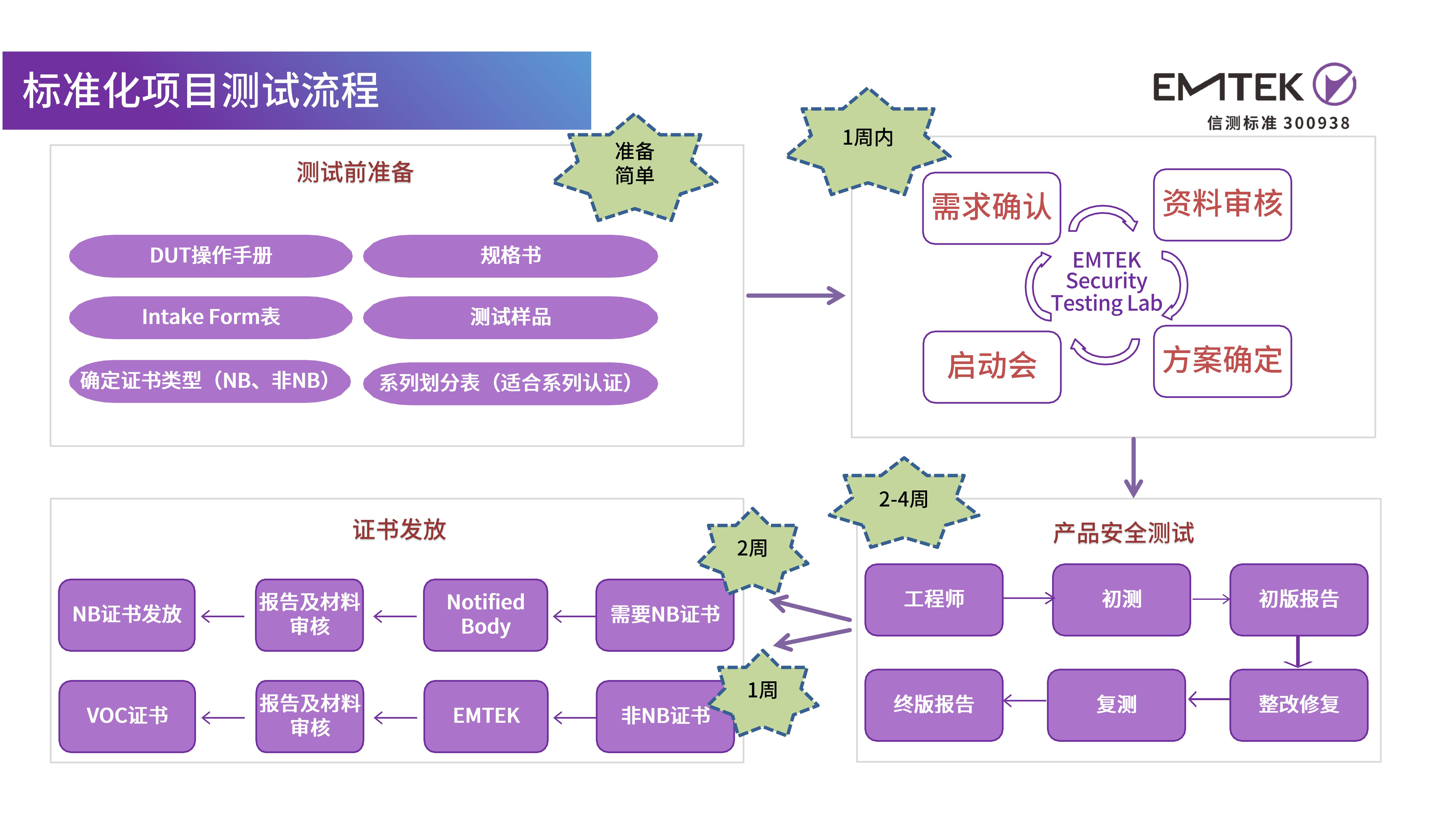 根據(jù)產(chǎn)品的功能復(fù)雜程度不同,評測周期也有所不同,一般情況下,在收到資料和樣機起算,4-5周內(nèi)可完成評測及發(fā)證。