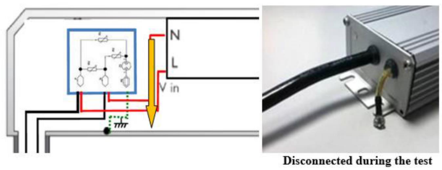 進(jìn)行耐電強(qiáng)度測(cè)試時(shí),可以斷開浪涌保護(hù)裝置,因?yàn)榻M件是符合 IEC 60598-1 中 10.2 a) 條款的并聯(lián)電容器?