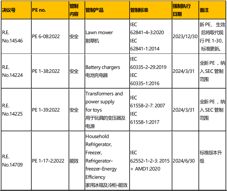 2022 年12 月消息,智利電力和燃料監(jiān)督局(SEC)近期發(fā)布了多項(xiàng)決議,批準(zhǔn)了割草機(jī),電池充電器,玩具用電源和冰箱冷柜四個(gè)產(chǎn)品的法規(guī)(PE)。