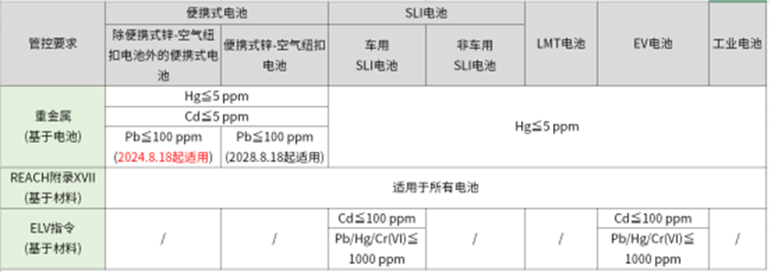 歐盟新電池法嚴(yán)格限制了電池中有害物質(zhì)的使用,具體要求如下圖所示: