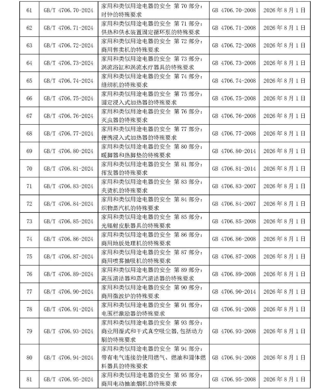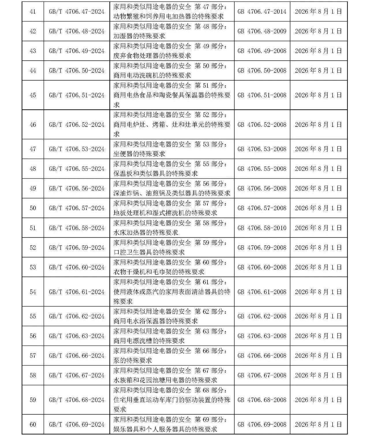 2024年7月24日,國家標(biāo)準(zhǔn)化管理委員會發(fā)布《關(guān)于批準(zhǔn)發(fā)布<壓力容器 第1部分:通用要求>等218項(xiàng)國家標(biāo)準(zhǔn)和1項(xiàng)國家標(biāo)準(zhǔn)修改單的公告》(中華人民共和國國家標(biāo)準(zhǔn)公告 2024年第15號)及《關(guān)于批準(zhǔn)發(fā)布<家用和類似用途單相插頭插座 型式、基本參數(shù)和尺寸>等12項(xiàng)強(qiáng)制性國家標(biāo)準(zhǔn)和1項(xiàng)強(qiáng)制性國家標(biāo)準(zhǔn)修改單的公告》(中華人民共和國國家標(biāo)準(zhǔn)公告 2024年第16號)。其中批準(zhǔn)發(fā)布GB 44246-2024《家用和類似用途電器、體育用品的電氣部分及電玩具 安全技術(shù)規(guī)范》強(qiáng)制性國家標(biāo)準(zhǔn)及GB/T 4706.1-2024《家用和類似用途電器的安全 第1部分:通用要求》等102項(xiàng)家電推薦性國家標(biāo)準(zhǔn),共計103項(xiàng)。