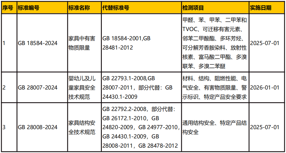 為充分發(fā)揮標(biāo)準(zhǔn)在家具產(chǎn)業(yè)中的規(guī)范引領(lǐng)作用,推動提升家具產(chǎn)品質(zhì)量安全水平,國家市場監(jiān)督管理總局,國家標(biāo)準(zhǔn)化管理委員會于2024年7月發(fā)布GB 18584-2024《家具中有害物質(zhì)限量》、GB 28007-2024《嬰幼兒及兒童家具安全技術(shù)規(guī)范》、GB 28008-2024《家具結(jié)構(gòu)安全技術(shù)規(guī)范》3項(xiàng)家具強(qiáng)制性國家標(biāo)準(zhǔn)。該3項(xiàng)標(biāo)準(zhǔn)由工業(yè)和信息化部歸口。三份強(qiáng)制性國家標(biāo)準(zhǔn)分別從限制家具有害物質(zhì)、家具結(jié)構(gòu)安全以及保障特殊人群安全三個方面制定了相關(guān)的技術(shù)指標(biāo)。
