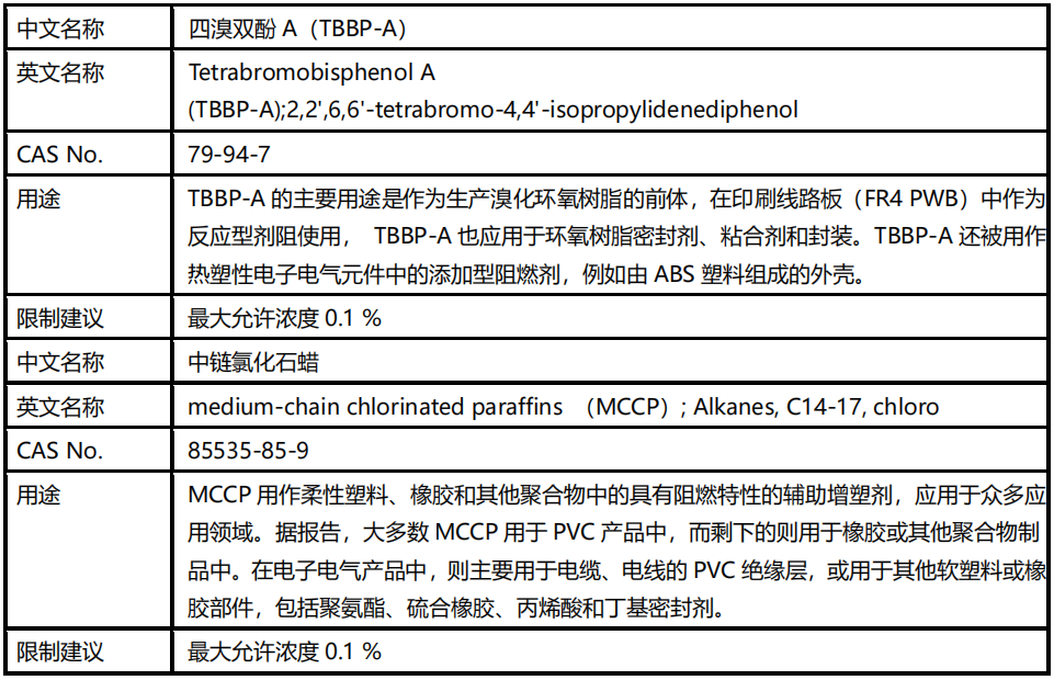 ? 2021 年,歐盟 RoHS 評估機構(gòu)發(fā)布 Pack15 的最終評估報告,建議將 TBBP-A 和 MCCPs 納入RoHS 限制。