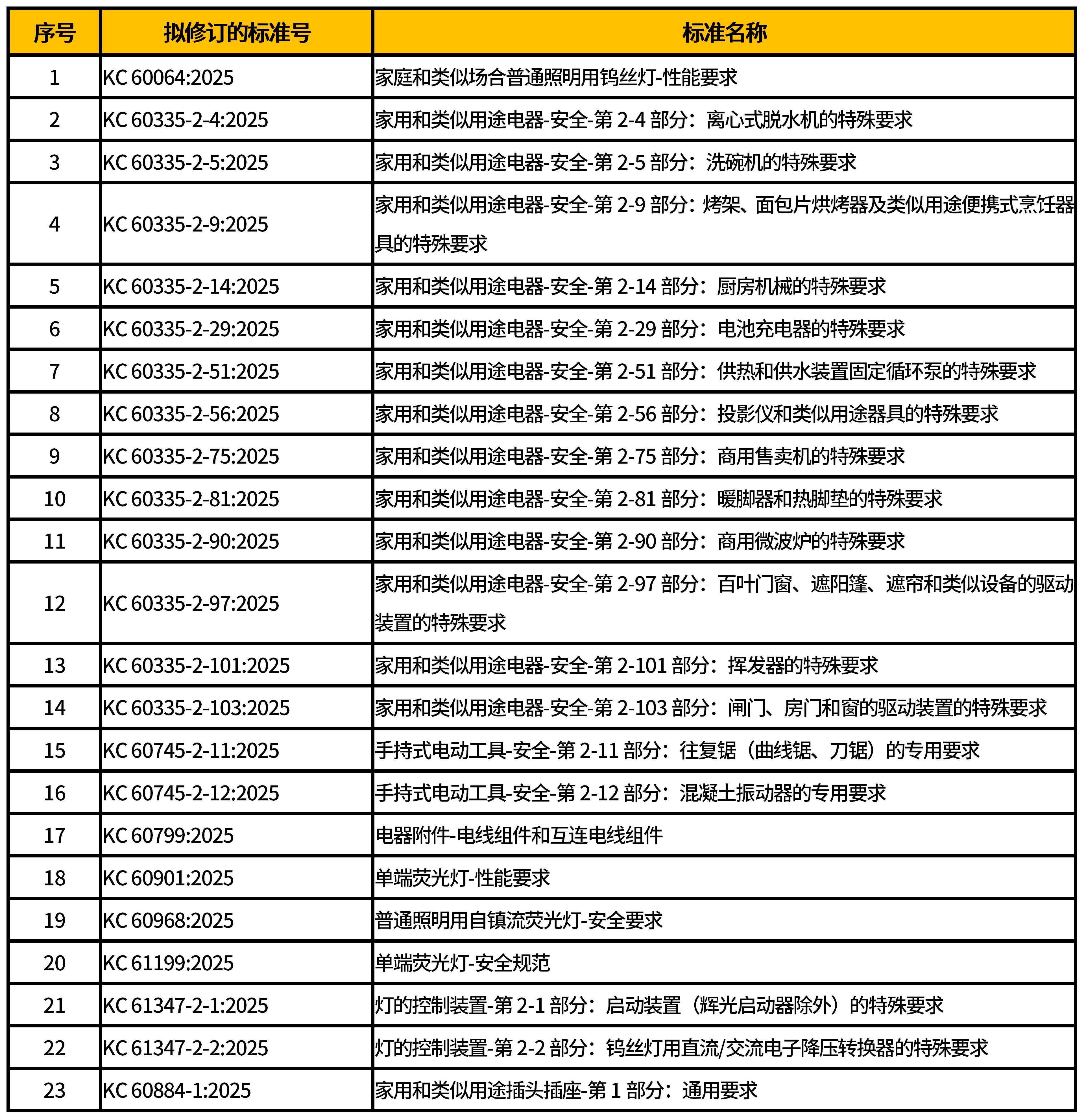 韓國國家標準技術(shù)研究院(KATS)于2025年5月22日發(fā)布公告,宣布修訂23項電氣安全標準,見表 1。新版標準自發(fā)布之日起生效,舊版標準仍可適用至2026年5月22日。