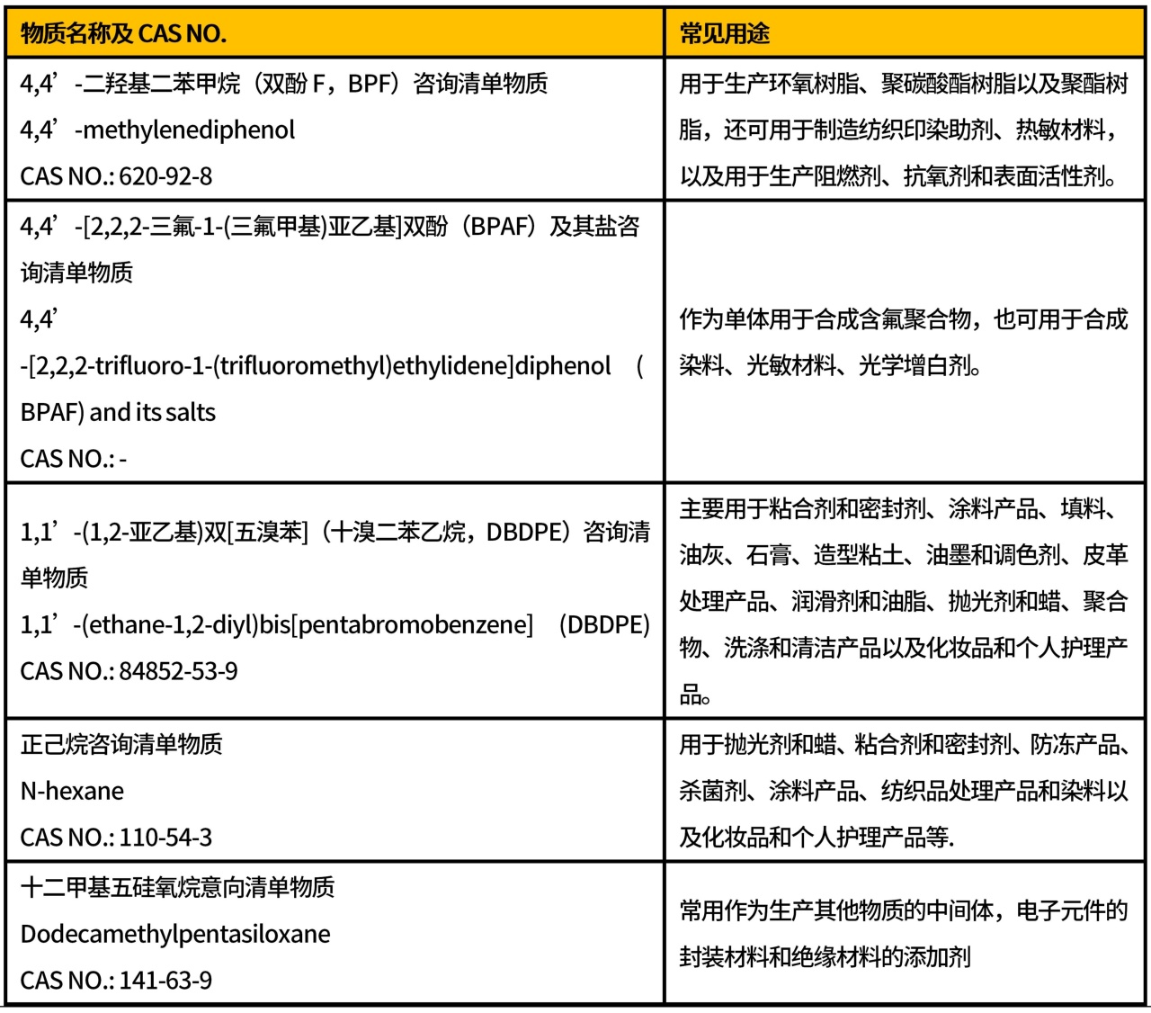 目前,SVHC咨詢清單物質(zhì)共4項(xiàng),意向清單物質(zhì)1項(xiàng),清單如下表: