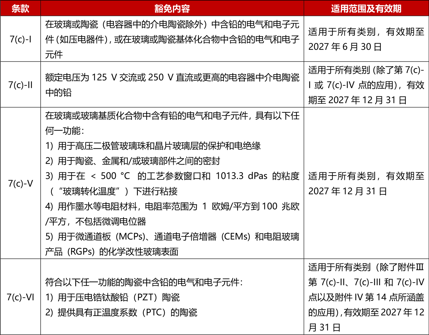 關(guān)于玻璃陶瓷電氣電子元件,RoHS指令附錄III的7(c)-I和7(c)-II豁免條款被替換,并新增7(c)-V和7(c)-VI豁免條款: