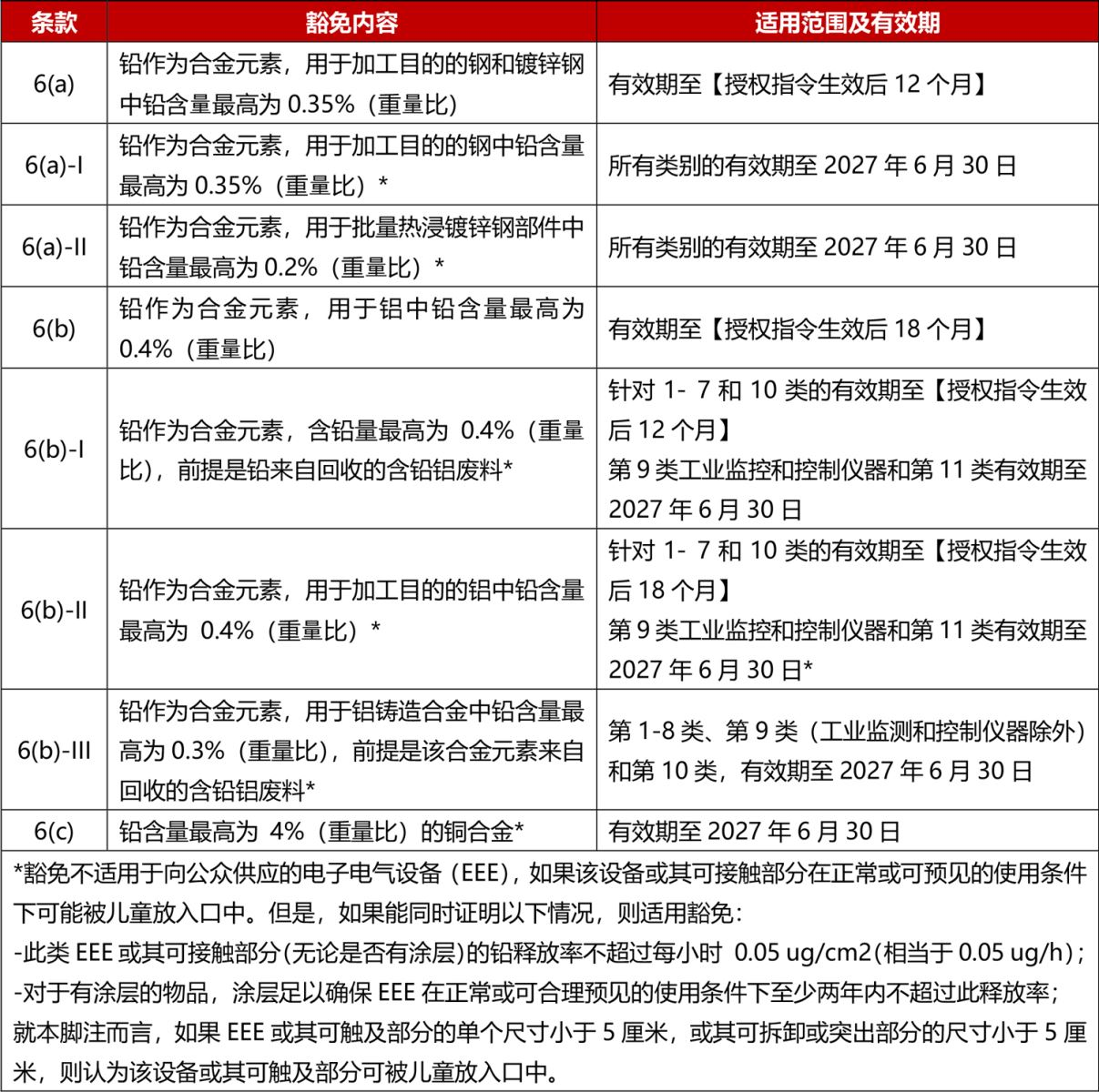 關(guān)于鋼合金、鋁合金和銅合金,RoHS指令附錄III的6(a),6(a)-I,6(b),6(b)-I,6(b)-II和6(c)條款被替換為以下內(nèi)容: