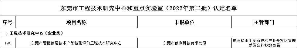 近日,東莞市科學(xué)技術(shù)局發(fā)布《市科技局關(guān)于認(rèn)定東莞市工程技術(shù)研究中心和重點實驗室(2022年第二批)的通知》,東莞市信測科技有限公司申報的東莞市智能信息技術(shù)產(chǎn)品檢測評價工程技術(shù)研究中心被正式認(rèn)定為東莞市工程技術(shù)研究中心。